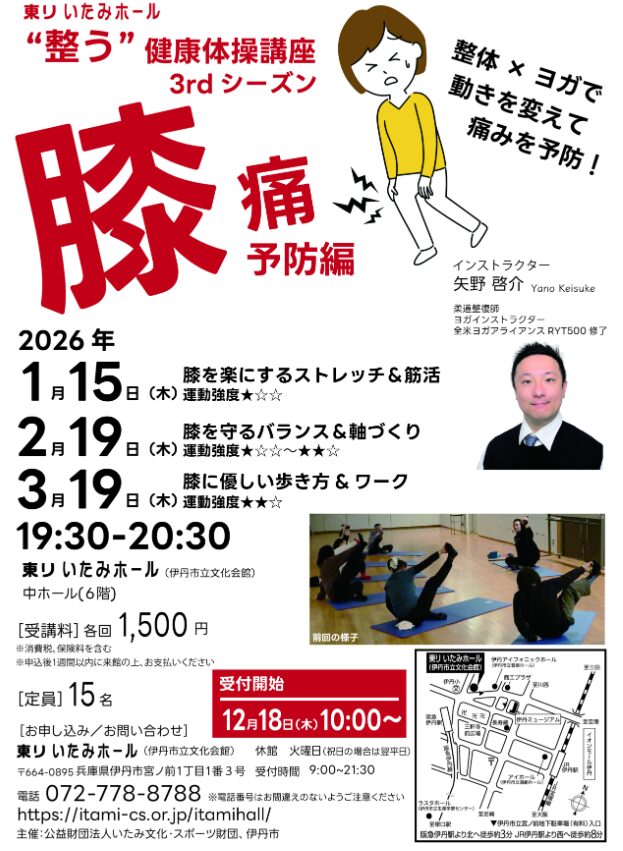 当院は開院3周年を機に、新事業を開始するとともにリニューアルオープンいただきました。その記念イベントとして、『整う 健康講座 膝痛予防編・全3回』をいたみホールで開催いたします。